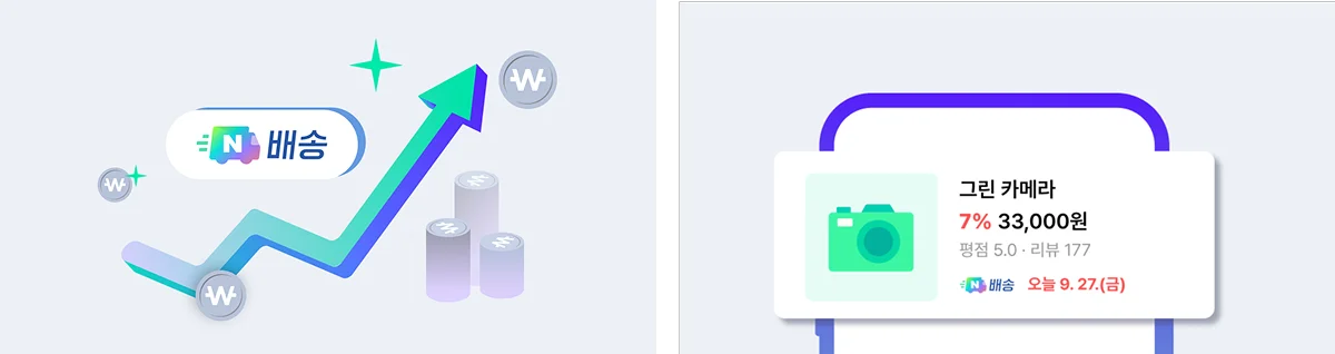 N배송은 쉬는 요일 없이 월요일부터 일요일까지 24시까지의 주문에 대해 제공하는 배송 서비스입니다. 빠른 배송의 공백이 없기 때문에 스토어의 배송 경쟁력을 강화할 수 있습니다.
